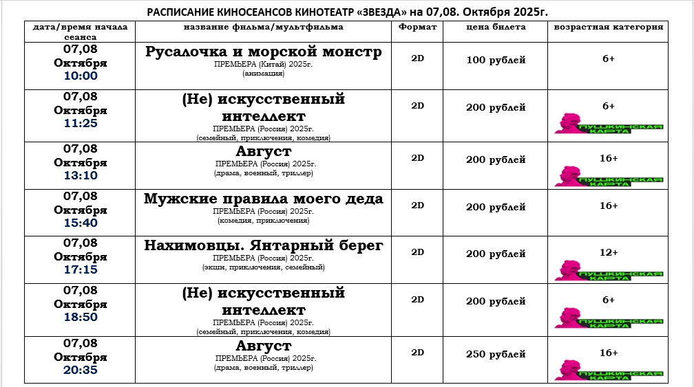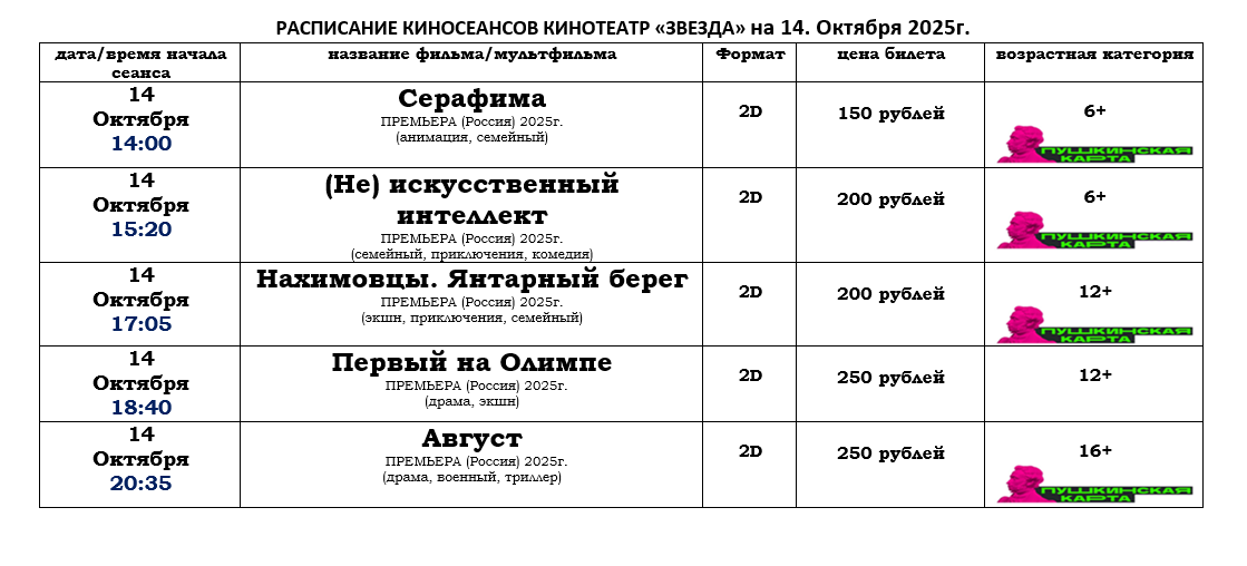 Расписание кинотеатра «Звезда» 1 - 8 октября